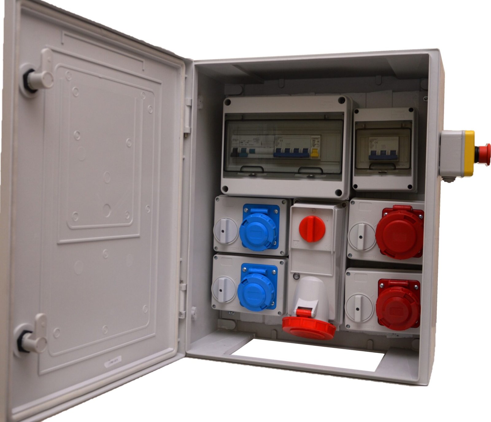 Prodotto in termoplastico di colore Grigio Ral cablato in fabbrica composto da maniglia di trasporto, n.2 prese Monofase Interbloccate 16A IP67 + n.2 prese Trifase interbloccate 3P+T 16A IP67 + n.1 presa Trifase Interbloccata 3P+N+T 32A + spina di alimentazione Fissa al quadro 3P+N+T 32A IP67 + PULSANTE DI EMERGENZA di colore rosso su sfondo giallo esterno al quadro.