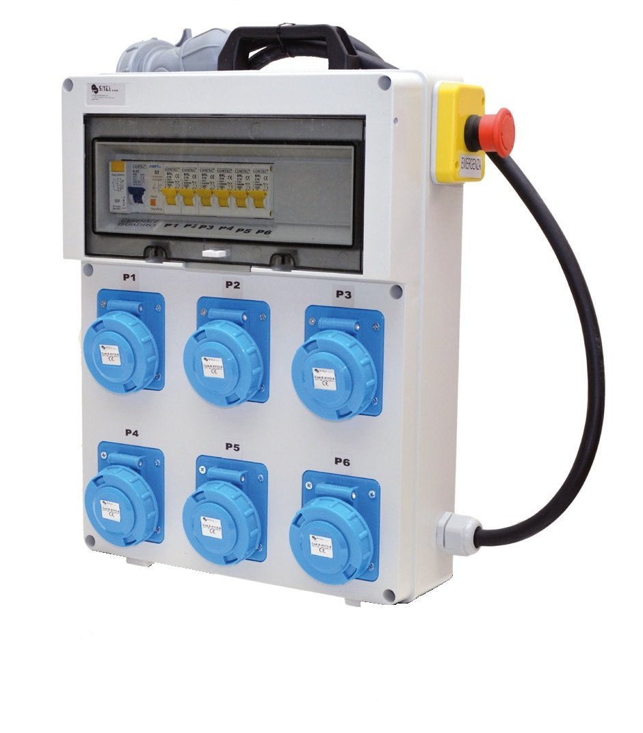 Prodotto in termoplastico di colore Grigio Ral cablato in fabbrica , composto da maniglia di trasporto, n.6 prese Monofase 16A IP67 , n.2 mt. di Cavo H07RN-F 3G6 mmq. + Pulsante di emergenza di colore rosso su sfondo giallo e spina di alimentazione 2P+T 32A IP67.